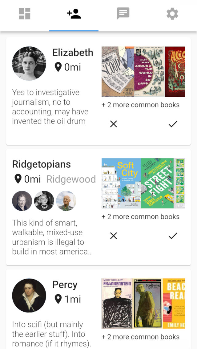 We're for all kinds of readers: fiction, non, genre, whatever. Tell us what you're reading, and the app will find people who are on the same page (sometimes literally).